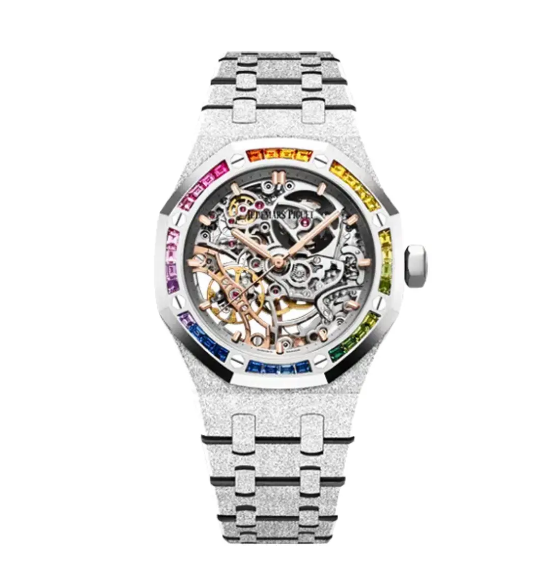 The case of the Royal Oak Frosted Gold Double Balance Wheel Openworked is made from 18-carat hammered white gold, offering both a luxurious appearance and exceptional durability. The bezel, set with 32 baguette-cut rainbow-colored sapphires (~2.24 carats), adds a brilliant pop of color to the overall design. Glareproofed sapphire crystal and a transparent caseback protect and showcase the intricate movement. Additionally, the screw-locked crown ensures water resistance and a secure fit.